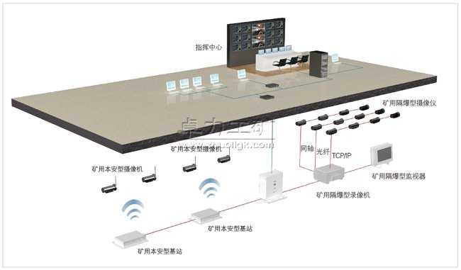 視頻監(jiān)控系統(tǒng)集煤礦移動視頻監(jiān)視裝置ZYSJ127和煤礦視頻監(jiān)視裝置ZSJ127于一身,我公司同時開發(fā)了有線固定監(jiān)視設備與無線移動監(jiān)視設備。視頻監(jiān)控系統(tǒng)由礦用隔爆兼本安型計算機、礦用本安攝像儀、本安型基站(WIFI基站)、移動監(jiān)視終端、礦用隔爆型攝像儀、礦用隔爆型錄像機、礦用隔爆型顯示器、防爆充電器等組成,用來以視頻形式監(jiān)測井下設備的工作狀態(tài),并集合存儲和顯示功能。此系統(tǒng)的投入可以提高工作效率,增強工作設備的安全性和可靠性。最終為設備的“無人值守”提供視頻依據。視頻系統(tǒng)以綜合管理軟件為核心,實現(xiàn)了基于網絡的點對點、點對多點、多點對多點的遠程實時現(xiàn)場監(jiān)視、遠程遙控攝像機以及錄像、報警處理等,通過兼容有線和無線視頻設備實現(xiàn)視頻系統(tǒng)的數(shù)字化統(tǒng)一管理。系統(tǒng)配置圖